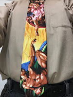 Today's tie honors the birthday of Michelangelo (1475-1564). His full name was Michelangelo di Lodovico Buonarroti Simoni. This image is the famous detail of the creation of Adam, from his painting of events in the book of Genesis on the ceiling of the Sistine Chapel in Rome.